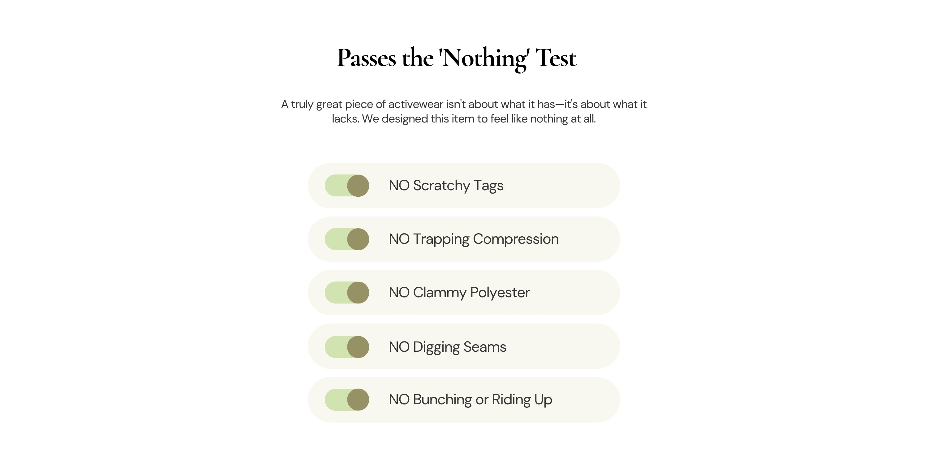 Your focus is sacred. That's why we engineered a fit that eliminates interruptions. No more hiking up your leggings after a roll-up or adjusting mid-plank. This design stays put, allowing for a seamless transition between movements and a truly uninterrupted flow state. We've removed every tag and potential annoyance.