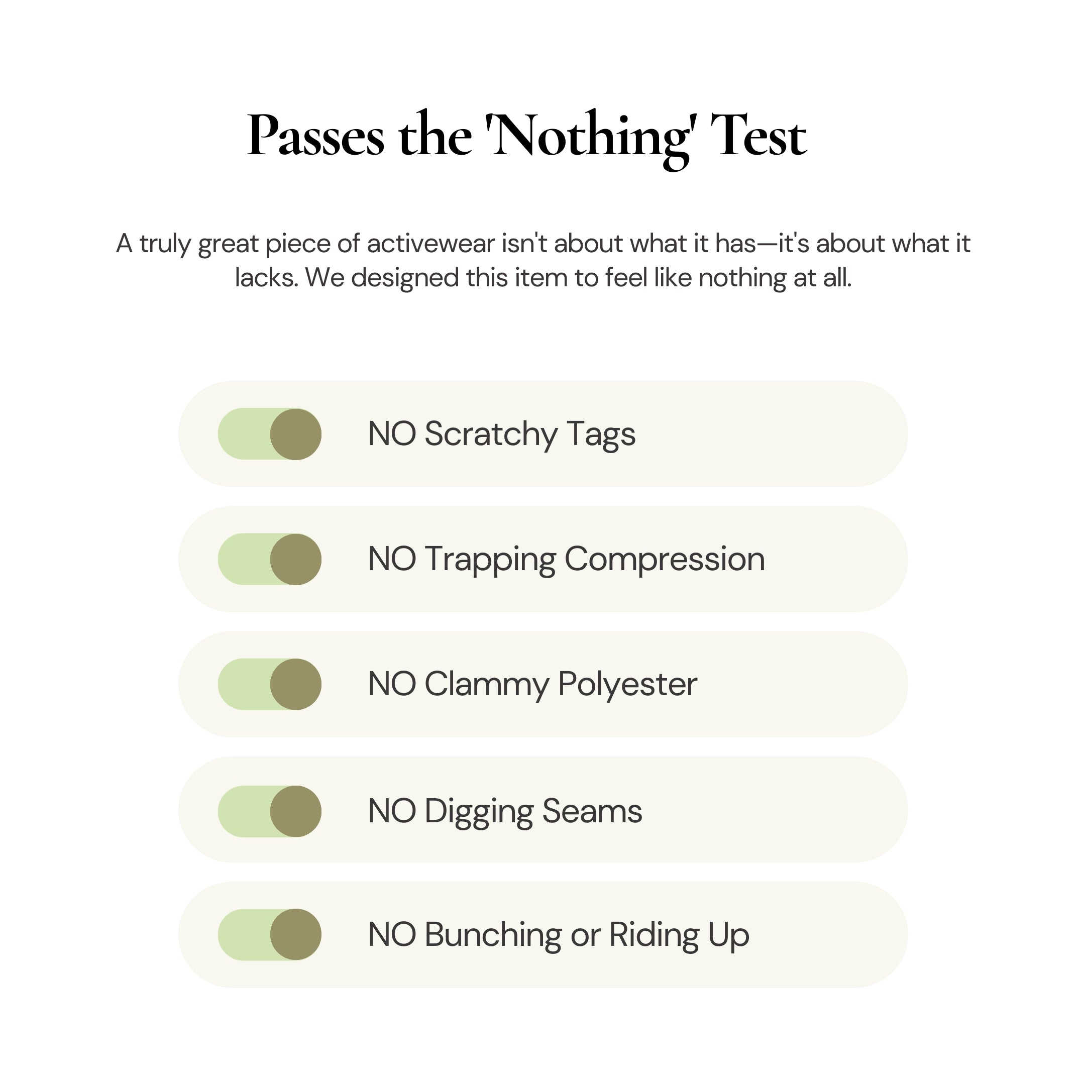 Your focus is sacred. That's why we engineered a fit that eliminates interruptions. No more hiking up your leggings after a roll-up or adjusting mid-plank. This design stays put, allowing for a seamless transition between movements and a truly uninterrupted flow state. We've removed every tag and potential annoyance.