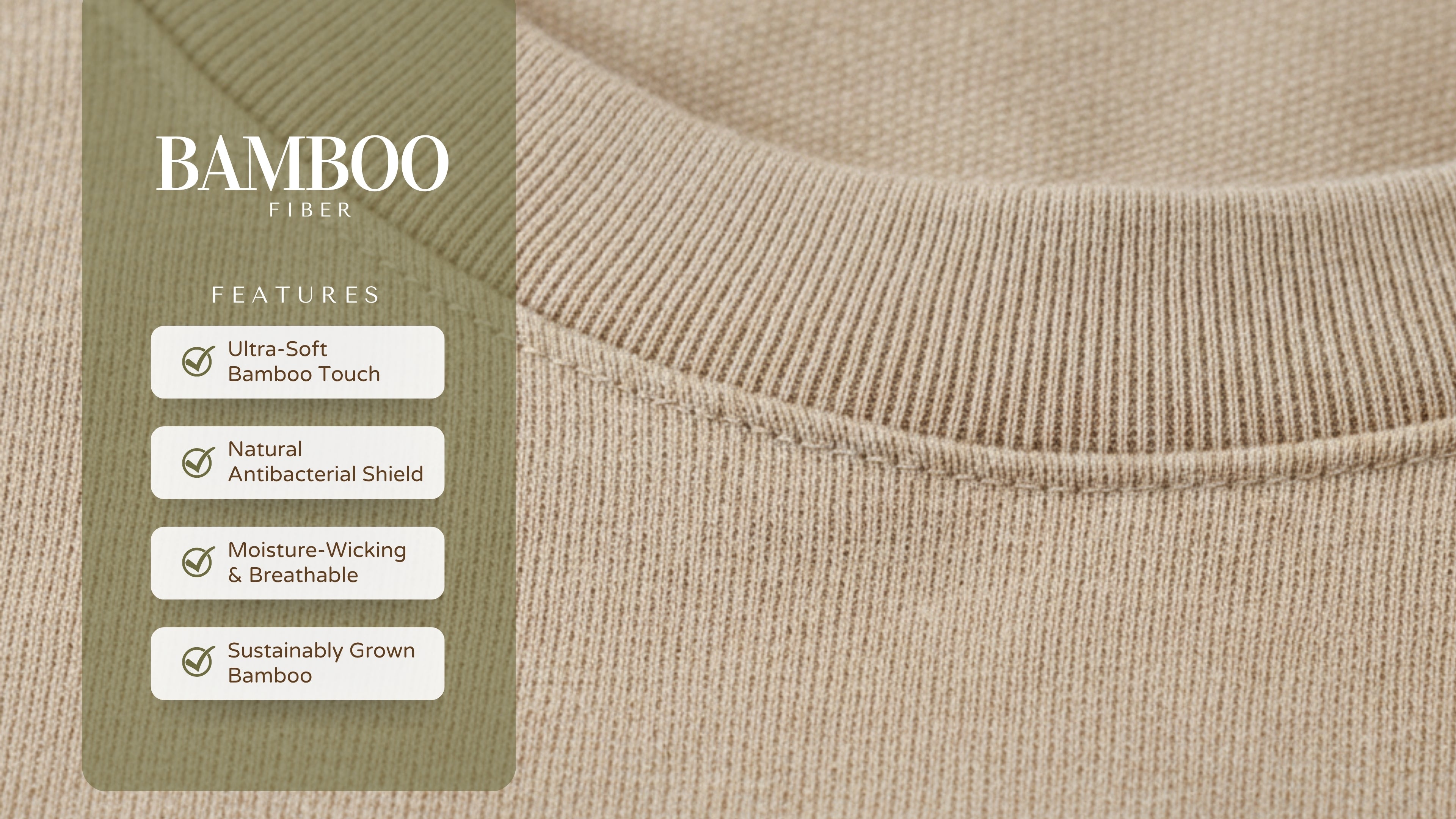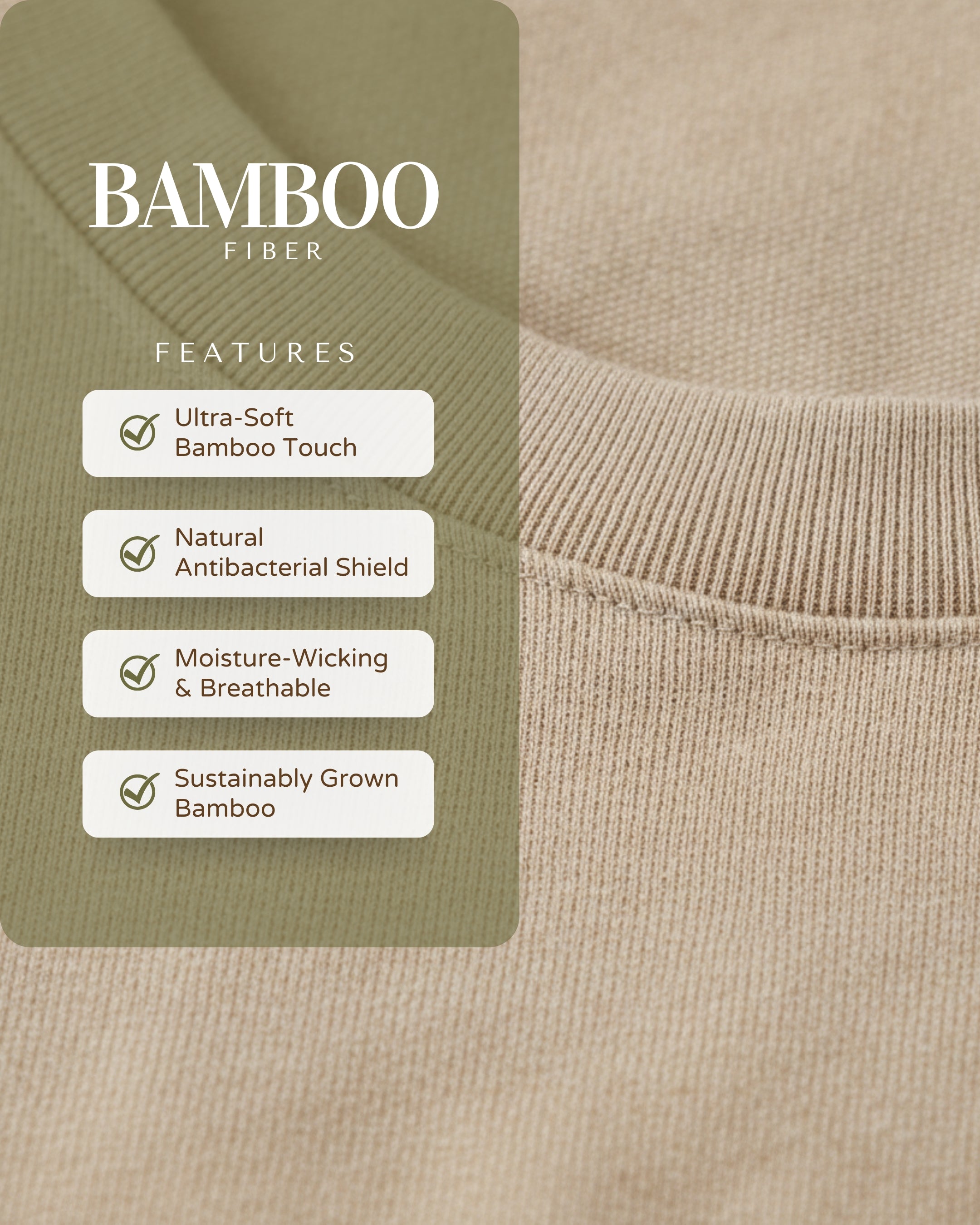 Each strand of bamboo is finely woven to create a smooth, breathable fabric that feels gentle against the skin and minimizes irritation. Naturally antibacterial and free from harsh synthetics, it keeps you fresh and comfortable throughout the day. With its temperature-regulating and moisture-wicking properties, it adapts effortlessly to your body’s needs — perfect for those who value calm, comfort, and clothing that simply feels right.